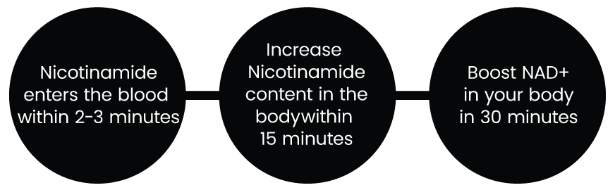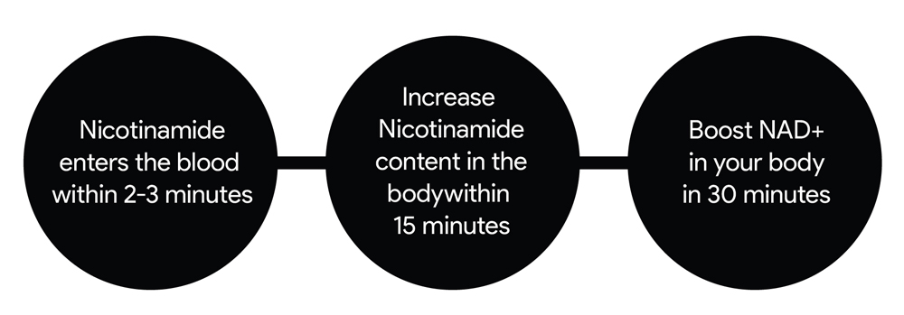 Research has found that Nicotinamide, due to its small molecular size, is easily absorbed into the body. Once inside the cells, it combines with alcohol and ATP to form NAD+, which helps repair DNA damage and delay aging.
