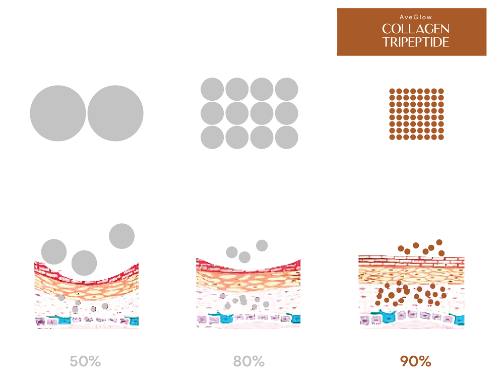 Collagen-Triple 20 is 1/1000th the size of typical collagen, with a molecular weight of about 500 Daltons, making it 600 times smaller than a standard collagen molecule. Its small molecular size allows it to penetrate the skin barrier more easily, facilitating rapid absorption by the skin.