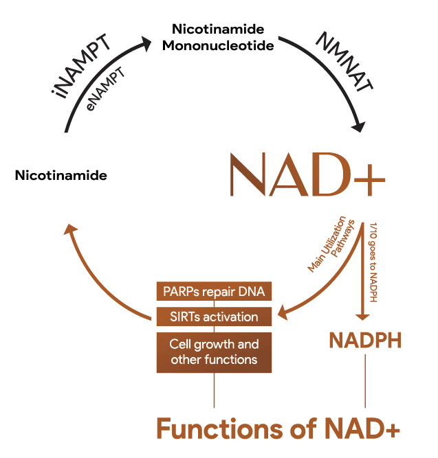 NAD+ is converted into Nicotinamide through three pathways: sirtuins, PARPs, and cADPR. Nicotinamide is then catalyzed by the enzyme NAMPT to form Nicotinamide Mononucleotide, which is further converted back into NAD+ by the enzymes NMNAT1-3.