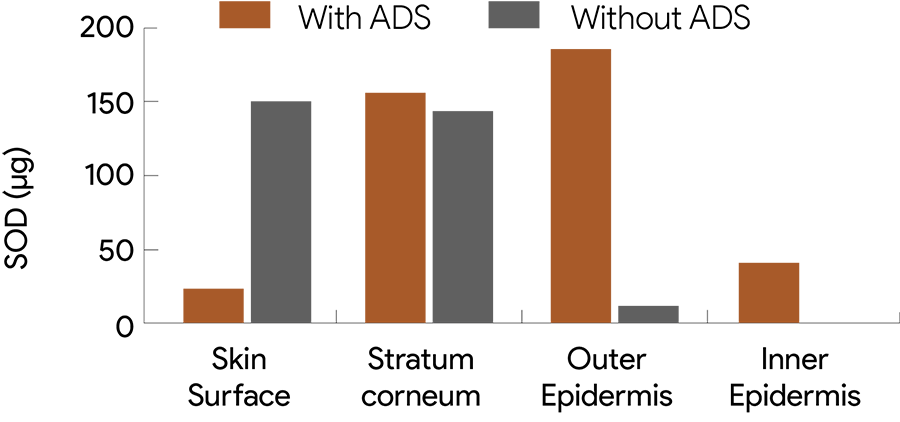 With ADS, SOD doesn’t stay at the skin surface but reach deeper in the epidermis